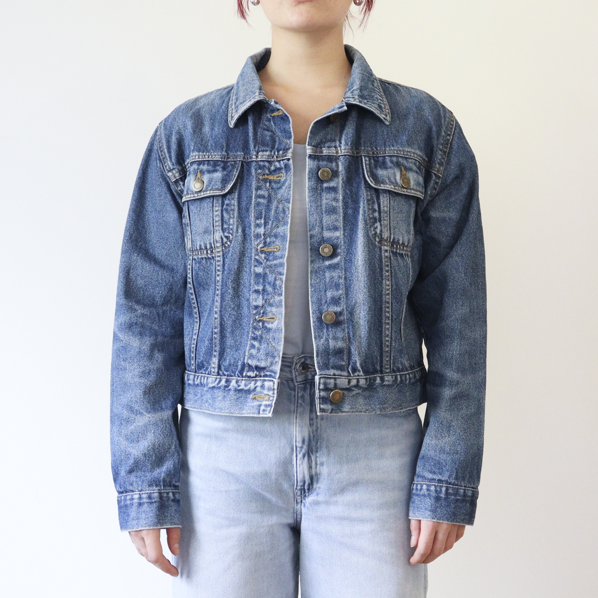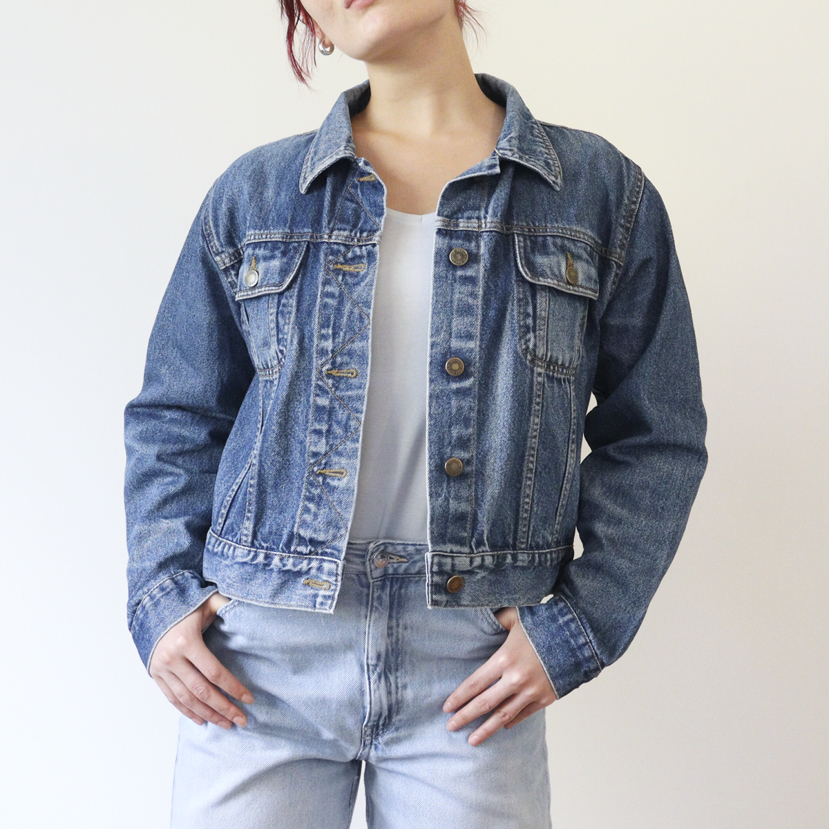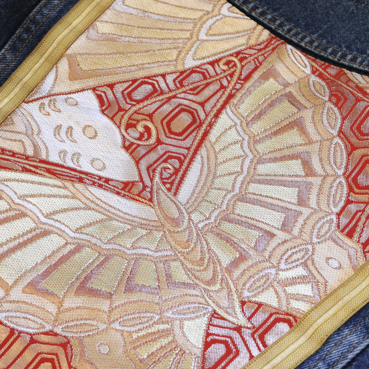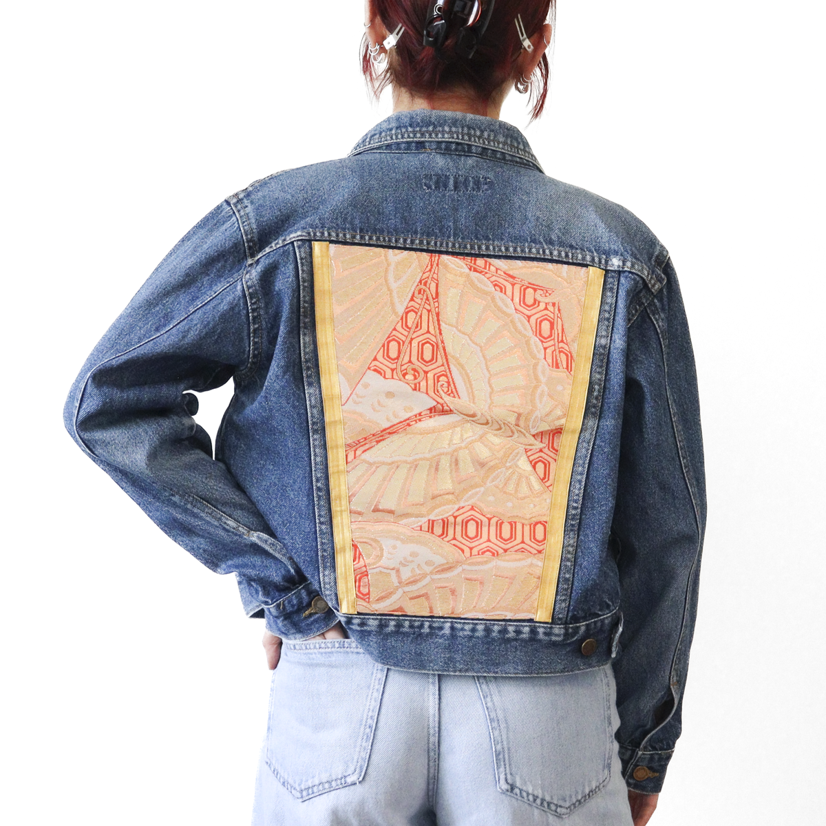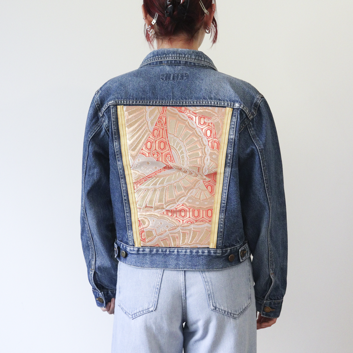 Matière: Veste 100% coton d’occasion, décorée d’une ceinture « Obi » recyclée en soie, et rubans en polyester.