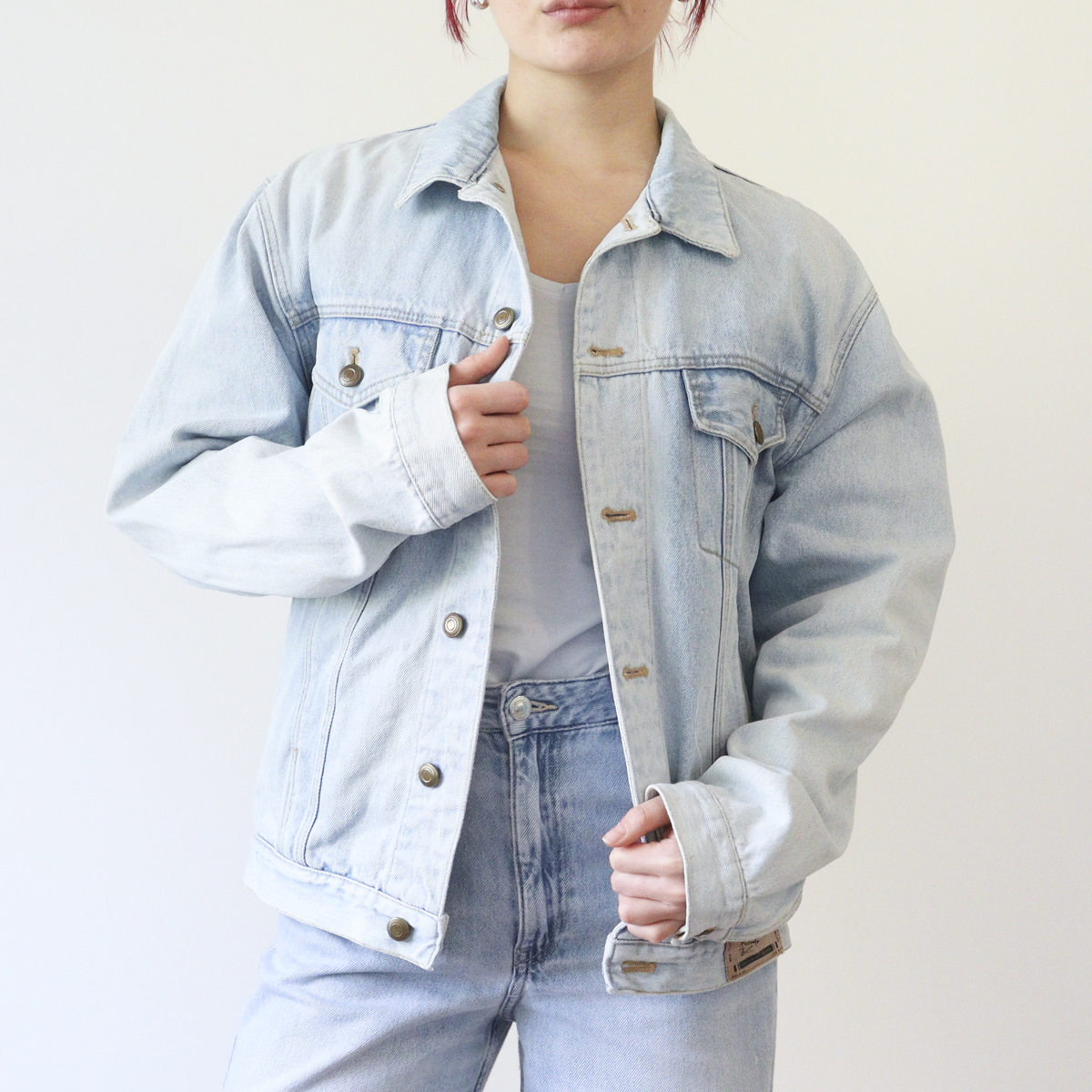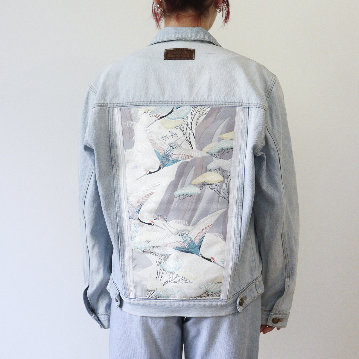 Matière: Veste 100% coton d’occasion, décorée d’une ceinture « Obi » recyclée en soie, et rubans en polyester.