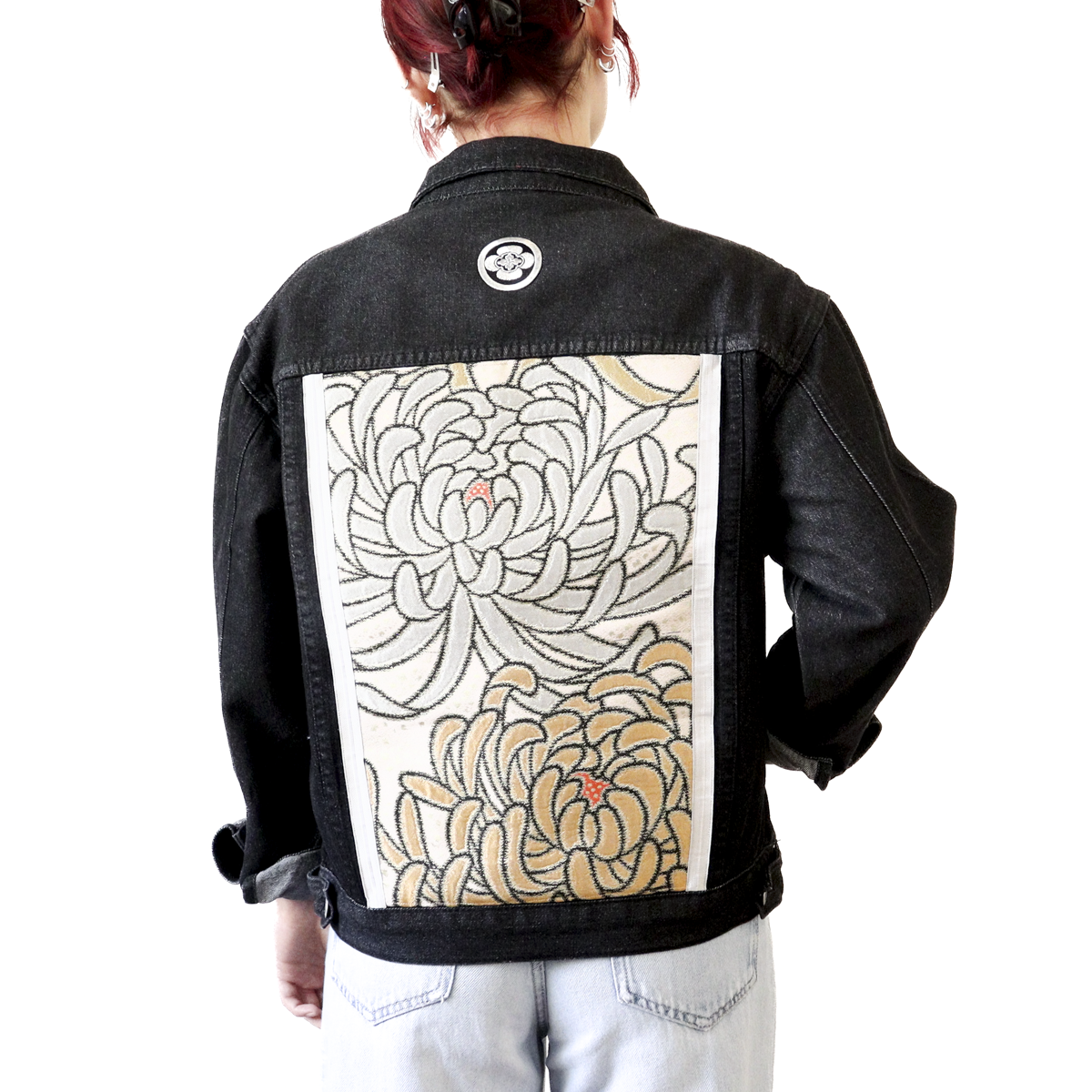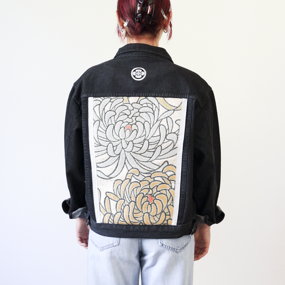 D’une férocité égalant mille soldats, Tomoé Gozen est une femme-samuraï du 12 ème siècle dont on ne cesse de vanter les victoires, au point où elle monta à ce grade fascinant mariant les honneurs de la personnalité historique, ainsi que de figure légendaire. Comme si ces éloges ne suffisaient pas encore à notre guerrière, l’histoire a gardé des traces comme quoi elle était aussi armée d’une beauté à couper le souffle. Finalement, il semble qu’une femme peut prendre soin de son apparence pour être la plus belle, non pour aller au bal et perdre une pantoufle de verre, mais aussi pour risquer sa vie sur un champ de bataille et égarer la tête d’un général ennemi qu’elle avait capturé. Bien que très féminine, la particularité de ce personnage reste sa dextérité dans le maniement des armes, couronnée d’un esprit stratège des plus aigus. Et comme toutes personnes osant arborer le titre de « Samuraï », Tomoé ne manquait ni d’honneur, ni de loyauté. Afin d’exprimer ce doux sentiment mélangeant la folie et le sang-froid qu’on ressent au moment où il faut protéger ses armoiries, cette veste est une expression moderne d’une armure qu’on porterait au combat afin de marquer son allégeance. Décorée d’un tissu sélectionné parmi les trouvailles les plus prestigieuses, l’emblème familial* vient ensuite décorer un denim noir qu’on ne peut teindre dans une autre couleur. Un tout qui affiche son appartenance pour un camp, et jamais un autre.